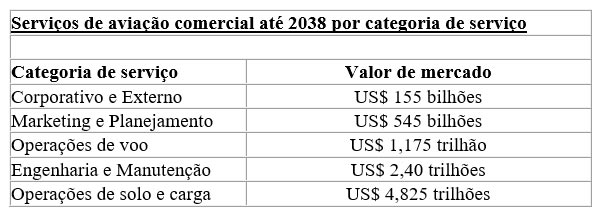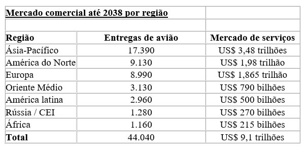- Previsão de 20 anos projeta um mercado comercial de US$ 16 trilhões, impulsionado pela crescente demanda por 44.040 novos jatos e serviços correspondentes