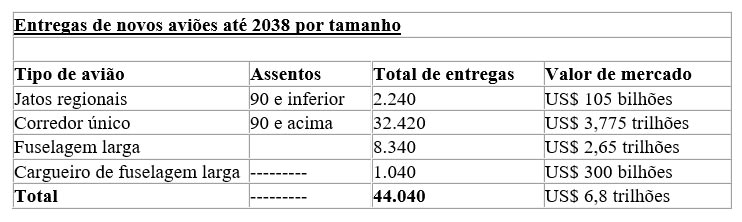 Em relação às novas entregas de aviões, os analistas dizem que 44% serão voltadas para a substituição de aeronaves antigas, enquanto o resto será para acomodar o crescimento do tráfego. Juntos, os novos jatos vão apoiar uma indústria em que o tráfego de passageiros crescerá em média 4,6% e o tráfego de carga crescerá em média 4,2%. Considerando os novos aviões e os jatos que permaneceriam em serviço, a frota comercial global deverá atingir 50.660 aviões até 2038. Esta é a primeira vez que a frota projetada atinge a marca dos 50 mil.