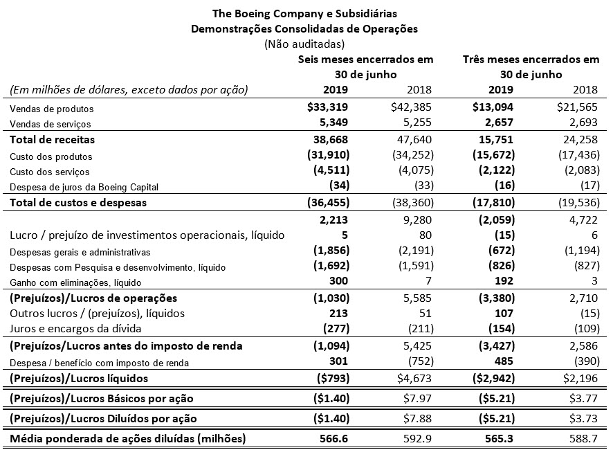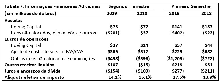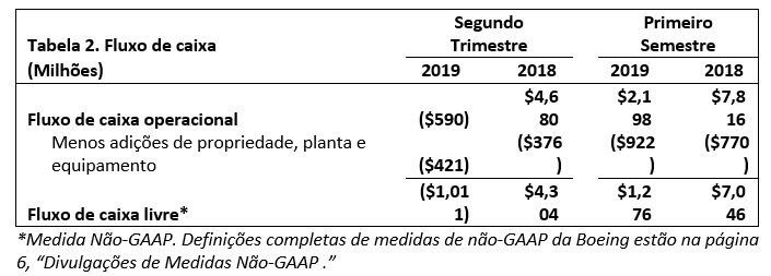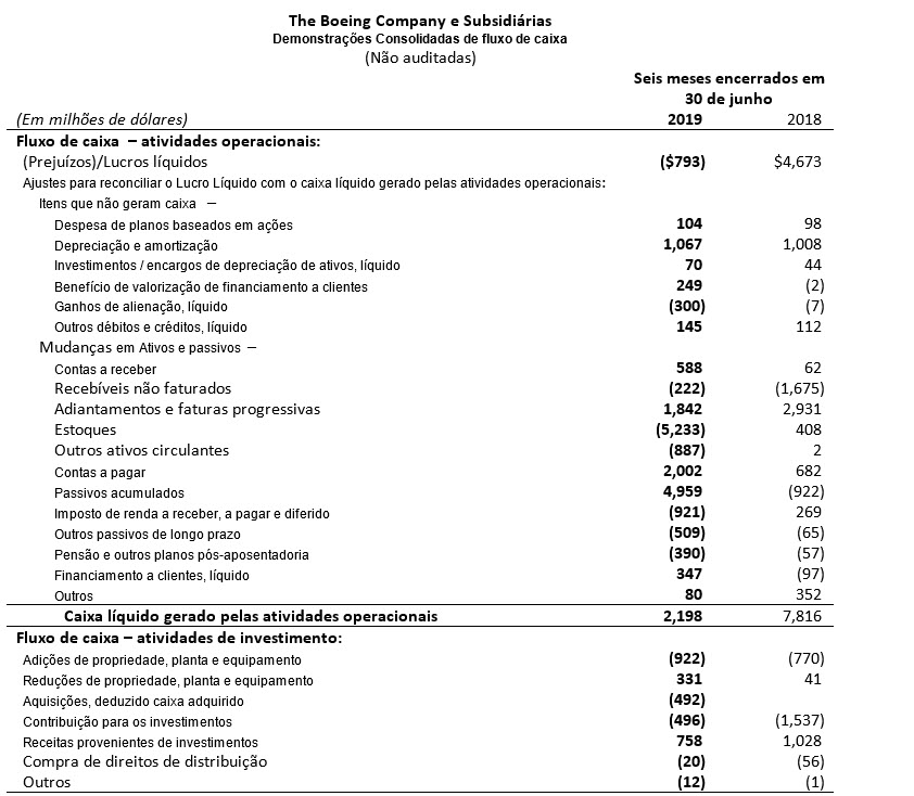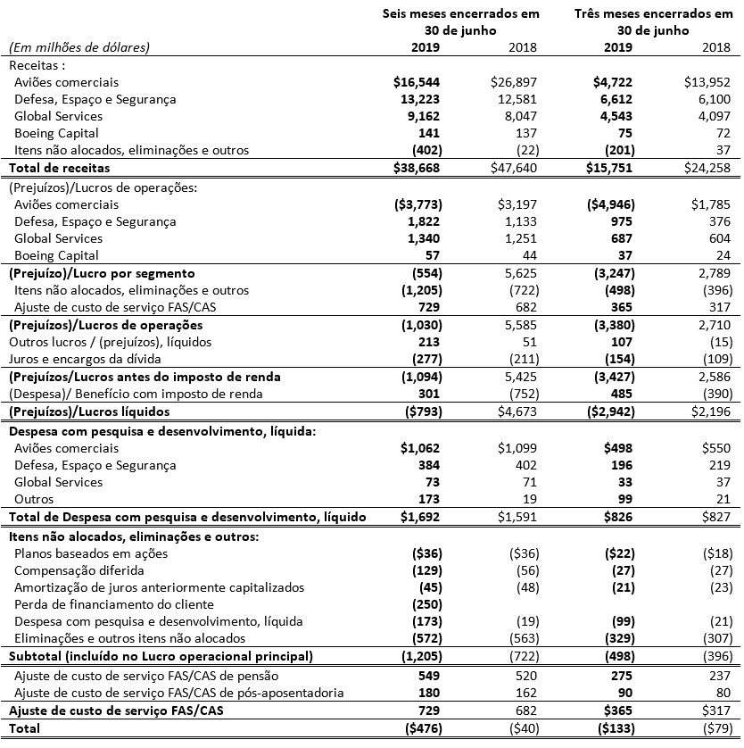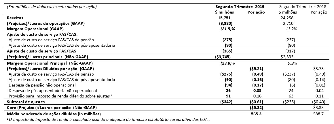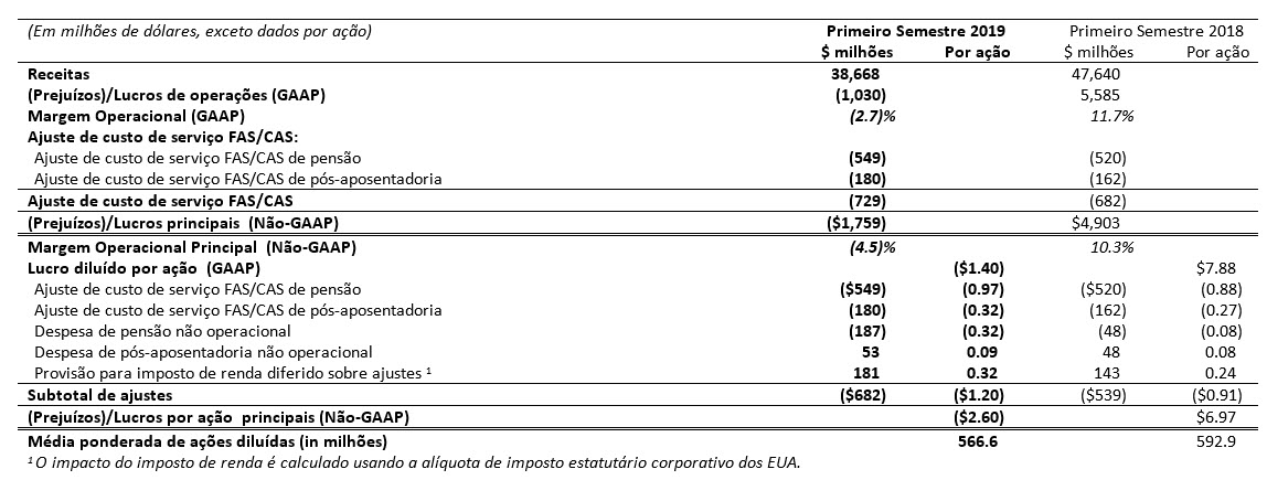(Prejuízos)/Lucros principais é definido como (Prejuízos)/Lucros de operações GAAP excluindo ajuste de custo de serviço FAS/CAS. O ajuste de custo de serviço FAS/ representa a diferença entre os custos do serviço de pensão e pós-aposentadoria do FAS, calculados de acordo com o GAAP, e os custos alocados aos segmentos de negócios. A Margem Operacional Principal é definida como (Prejuízos)/Lucros principais expressos as em percentagem da receita. Os (Prejuízos)/Lucros por ação principais são definidos como (Prejuízos)/Lucros por ação diluídos GAAP, excluindo o impacto dos (Prejuízos)/Lucros líquidos por ação do ajuste de custo de serviço FAS/CAS e despesas não operacionais com pensão e pós-aposentadoria. As despesas não operacionais com pensão e pós-aposentadoria representam os componentes dos custos líquidos dos benefícios periódicos, além do custo do serviço.