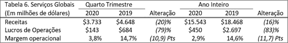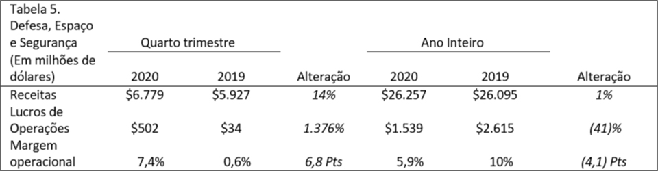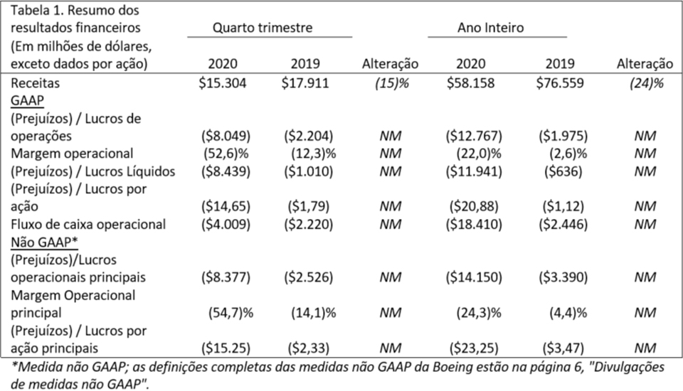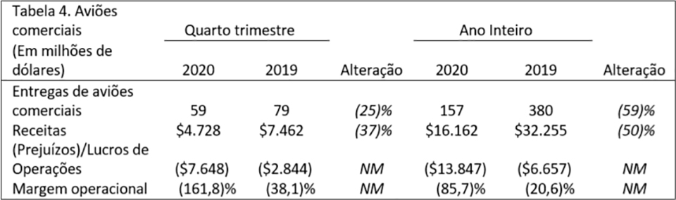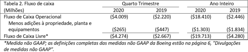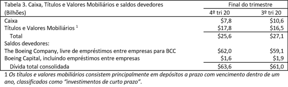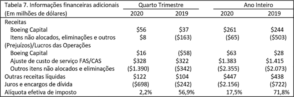 No final do trimestre, o saldo líquido do portfólio da Boeing Capital era de US$ 2,0 bilhões. A alteração na receita de outros itens não alocados e eliminações foi principalmente devida ao cronograma de eliminações para entregas de aeronaves entre empresas. Outros itens não alocados e eliminações incluíram encargos de US$ 744 milhões relacionados ao acordo anunciado anteriormente entre a Boeing e o departamento de Justiça do EUA em janeirode 2021. Os juros e encargos de dívida aumentaram devido aos saldos mais altos das dívidas. A alíquota efetiva de imposto para o quarto trimestre de 2020 reflete principalmente um subsídio de avaliação adicional sobre certos ativos de imposto de renda diferidos, parcialmente compensado pelos benefícios fiscais relacionados à provisão de compensação de prejuízo operacional líquido de cinco anos na Lei de Auxílio, Alívio e Segurança Econômica do Coronavírus (CARES).