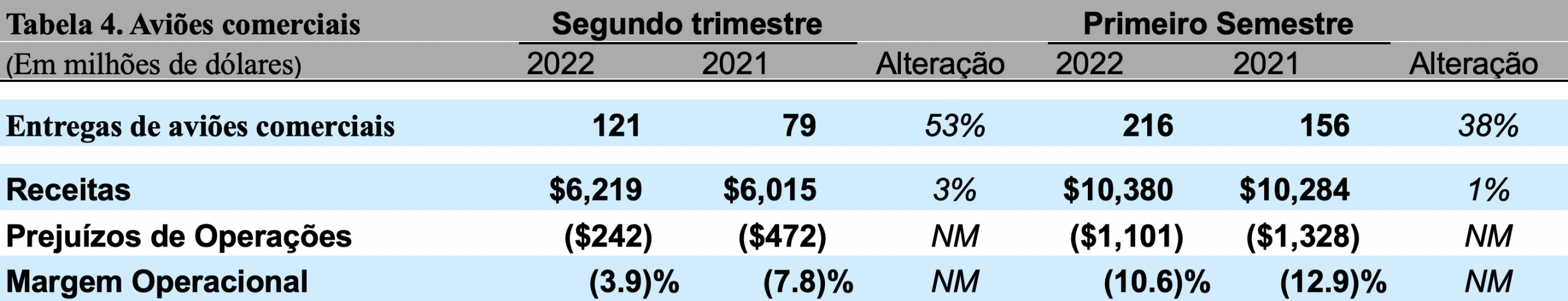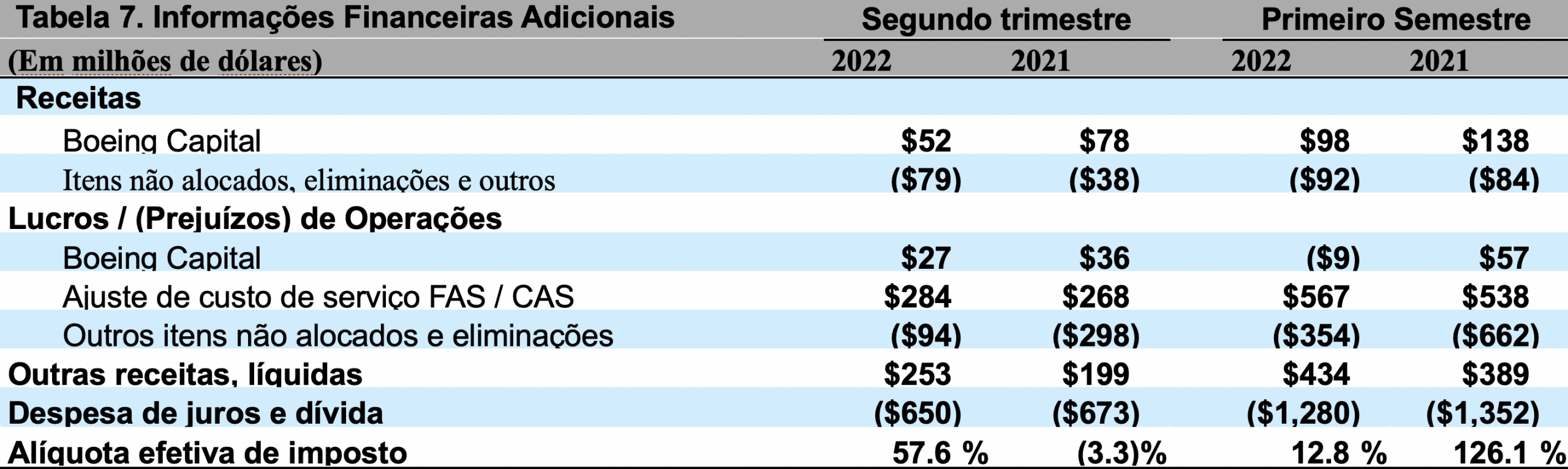 No final do trimestre, o saldo líquido do portfólio da Boeing Capital era de US$ 1,6 bilhão. A alteração no prejuízo de outros itens e eliminações não alocados deveu-se principalmente ao reconhecimento da receita de compensação diferida em comparação com a despesa registrada no segundo trimestre de 2021. A alíquota efetiva de imposto para o segundo trimestre reflete principalmente a despesa de imposto sobre o lucro antes dos impostos e um aumento na dedução de valorização.