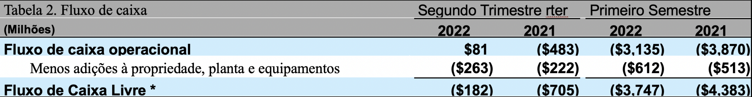 Fluxo de Caixa Livre é definido como Fluxo de Caixa Operacional GAAP, sem despesas de capital para adições de propriedades, plantas e equipamentos. A administração acredita que o Fluxo de Caixa Livre oferece aos investidores uma perspectiva importante sobre o caixa disponível para acionistas, pagamento de dívida, e aquisições depois de fazer os investimentos de capital necessários para apoiar as operações de negócios em andamento e criar valor a longo prazo. O Fluxo de Caixa Livre não representa o Fluxo de Caixa residual disponível para despesas discricionárias, pois ele exclui certas despesas obrigatórias, tais como pagamento de dívidas que vão vencer. A Administração utiliza a Fluxo de Caixa Livre como uma medida para avaliar tanto o desempenho dos negócios quanto a liquidez geral. A Tabela 2 apresenta uma reconciliação entre Fluxo de Caixa Livre e Fluxo de Caixa Operacional GAAP.